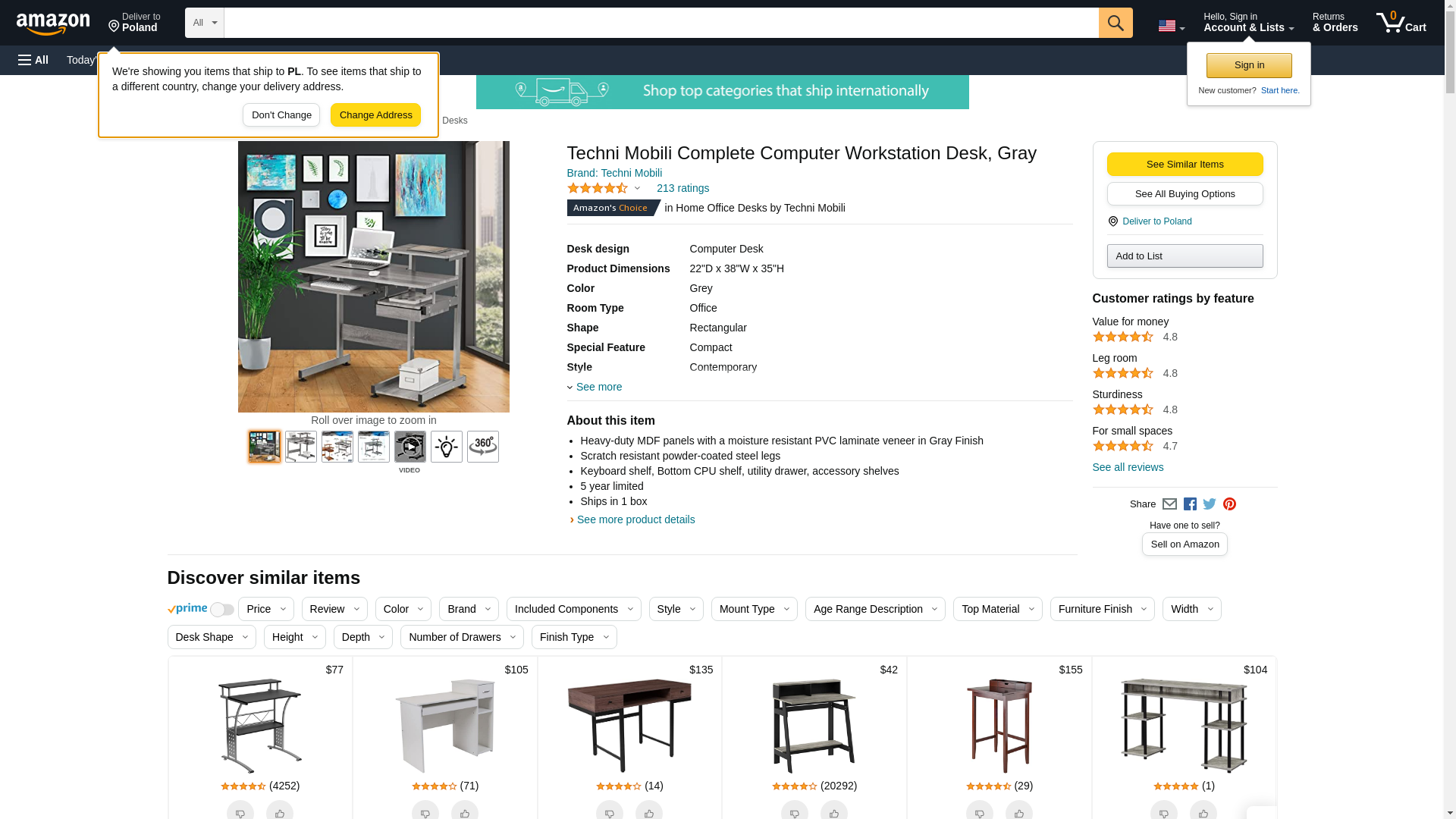 Techni Mobili Complete Computer Workstation Desk, Gray, 37.75" W x 22" D x 35" H,Grey