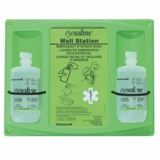 HONEYWELL EYE AND FACE WASH 16 OZ. TWO BOTTLE STATION, 1 BOTTLE DURABLE, OPEN-FACE DESIGN WALL STATIONS HOLD BOTTLES FIRMLY IN PLACE WITH EASY ACCESS TO BOTTLES IN AN EMERGENCY TO PROVIDE IMMEDIATE FLUSHING UNTIL THE INJURED PERSON CAN BE HELPED TO A PRIMARY EMERGENCY EYEWASH DEVICE. THEY OFFER HIGH VISIBILITY IN A HAZARD AREA AND ARE READILY AVAILABLE FOR EMERGENCY FLUSHING AND DECONTAMINATION OF THE EYES, FACE AND BODY. EACH SYSTEM IS DESIGNED FOR EASY "SNAP-OUT" ACCESS TO EYEWASH OR BODY FLUSH BOTTLES. WALL STATIONS MOUNT EASILY WITH PROVIDED FASTENERS. INTEGRAL OVERHANG PROTECTS BOTTLES FROM DUST AND DEBRIS TO MINIMIZE MAINTENANCE REQUIREMENTS. DURABLE PLASTIC IS EASY TO CLEAN. ALL WALL STATIONS INCLUDE PERSONAL EYEWASH OR BODY FLUSH. EXTENDED FLOW OPENING PROVIDES LONGER FLOW RATE THAN CONVENTIONAL BOTTLES.