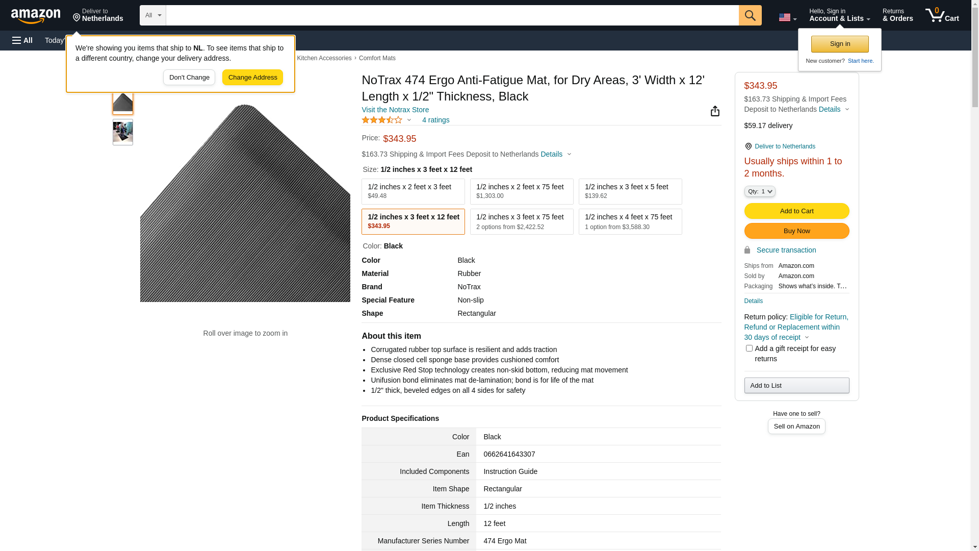 NoTrax 474 Ergo Anti-Fatigue Mat, for Dry Areas, 3' Width x 12' Length x 1/2" Thickness, Black