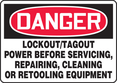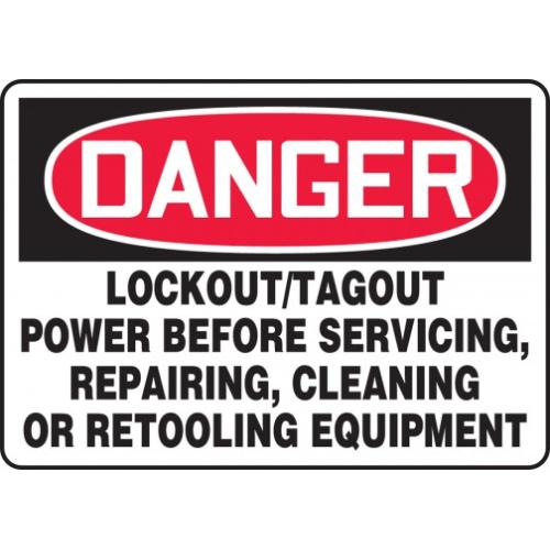 Accuform MLKT279VA Aluminum Safety Sign, Legend "Danger Lockout/TAGOUT Power Before Servicing, Repairing, Cleaning OR RETOOLING Equipment", 7" Length x 10" Width, Red/Black on White