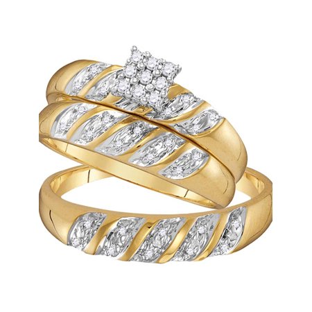 10kt Yellow Gold His & Hers Round Diamond Cluster Matching Bridal Wedding Ring Band Set 1/10 Cttw. Combined diamond weight of 1/10 carats total weight represents a range of 0.09 - 0.11 cts. t.w.