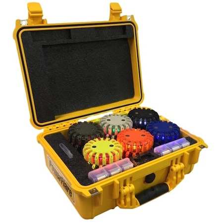 24-pack hard case, contains: 4 PF210-I-OD (PowerFlare, Infrared LEDs, Olive Drab Shell), 4 PF210-R-Y (PowerFlare, Red LEDs, Yellow Shell), 4 PF210-B-BL (PowerFlare, Blue LEDs, Blue Shell), 4 PF210-G-T (PowerFlare, Green LEDs, Tan Shell), 4 PF210-W-BK (PowerFlare, White LEDs, Black Shell), 4 PF210-A-O (PowerFlare, Amber LEDs, Orange Shell), 24 ea. spare CR123A batteries. Note: Contains four infrared units--these require night vision optics.