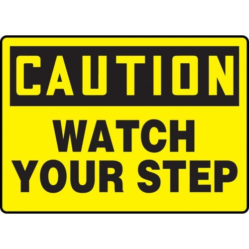 OSHA Safety Signs - CAUTION: Watch Your Step, 14" x 20". Two-ply, poly-carbonate plastic with industrial-strength backing. Resists fading, chemicals, corrosion, abrasions, cracking, and chipping. Non-glare reverse and subsurface print encapsulated by permanently bonded embossed poly surface. <br>Rounded corners and 1/4" mounting holes on most sizes. Service temperature range: Poly-carbonate at -60 to 260 F; backing -40 to 176 F.<br><br>Accu-Shield is the highest performance sign material, with an extended 15-year outdoor durability guarantee. The non-glare polycarbonate plastic is specially formulated to resist color change, chemicals, corrosion, vandalism, and abrasions - and will continue to look good for years while maintaining its superior strength. The two-ply, heavy-duty construction provides a rugged yet stylish appearance.<br><br>The legend and message are reverse-printed with UV resistant inks on the underside of the clear polycarbonate. This sub-surface image is sealed with further protection on the backside by a permanently bonded, laminated poly sheet. A composite sign, .189" thick, will not crack, chip, fade, or become brittle under extreme environments. Use indoors and outdoors. with service temperature range for poly-carbonate at -60 degrees to 260 degrees F. and under layer surface -40 degrees to 176 degrees F.
