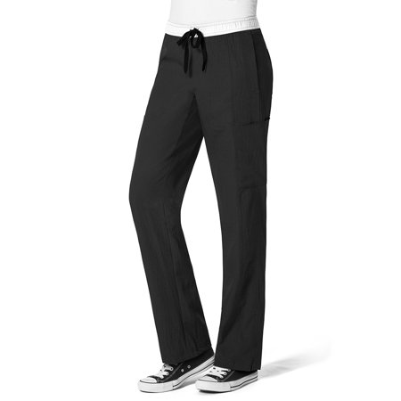 An elastic waistband with adjustable drawstring tie closure helps you find the perfect fit in this Four Stretch by WonderWink Women's Drawstring Elastic Waist Cargo Scrub Pant. Plentiful in pocket space this 100% polyester construction is ideal for keeping your tools organized when you're on the move. Junior fit Mid-rise Straight leg Elastic waistband with adjustable drawstring tie closure Two front slip pockets Two cargo patch pockets one with interior mesh compartment and exterior pocket Bungee cord at pocket Front leg seaming Two back patch pockets Side vents at hem TIP: This pant updates style 5214 with additional pockets and stylish accents. 100% Polyester Total inseam: 31"