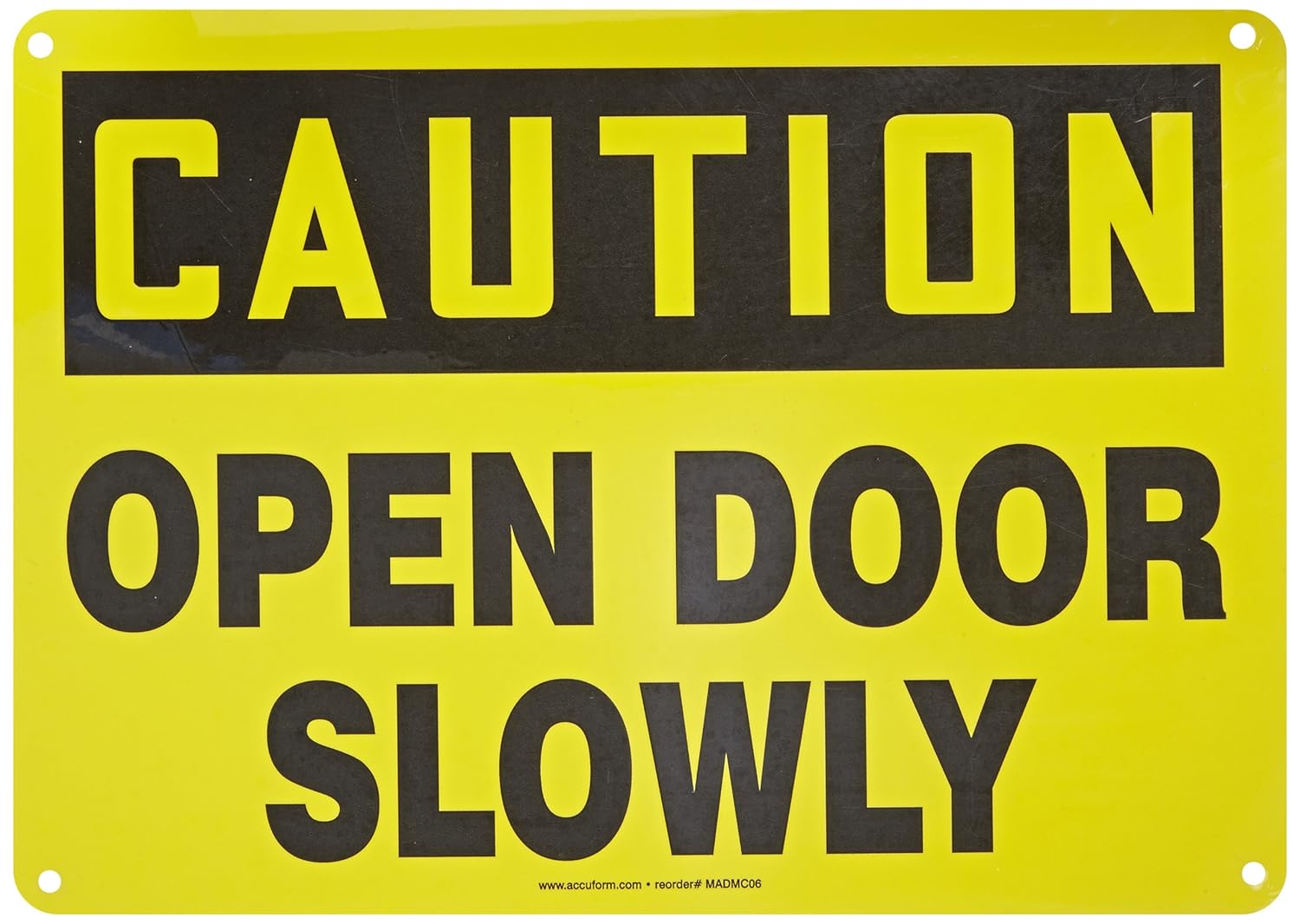 Accuform, MABR607VA, 10" x 14" OSHA Caution Safety Sign "Open Door Slowly" Aluminum Features: Stands up indoors and out Thin enough to conform to curved surfaces .032 inches thick for strength and flexibility Finished with four mounting holes