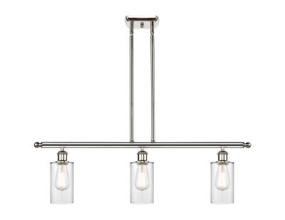 INNOVATIONS LIGHTING 516-3I-PN-G802-LED Clymer 3 Light Island Light. The Clymer 3 Light Island Light is part of the Ballston Collection. Includes 10 Feet Wire. Includes 2-6 and 4-12 inch Stems With Solid Brass 90 Degree Hang Straight Swivels for Sloped Ceilings. Solid Brass 90 Degree Hang Straight Swivel for Sloped Ceilings Included. Collection: Ballston. Material: Steel, Cast Brass, Glass. Metal Finish(Body): Polished Nickel. Metal Finish (Canopy/Backplate): Polished Nickel. Dimension(in): 12(H) x 36(W) x 3.875(Ext). Min/Max Height (Fixture Height with Shade, Cord or Included Stems & Canopy)(in): 21.375/45.375. Wire/Cord: 10 Feet Of Wire. Stem: 2-6 and 4-12 inch downrods. Sloped Ceiling Compatible: Yes. Maximum Wattage Per Socket: 100. Bulb: (3)3.5 Watt LED Vintage Medium Base Bulb Included. Dimmable: Yes. Color Temperature(Kelvin): 2700. Lumens: 350. Color Rendering Index(CRI): 82. Voltage: 120. Glass Shade Description: Clear Clymer. Glass Type: Transparent; Ribbed. Glass or Metal Shade Shape: Drum. Glass or Metal Shade Color: Clear. Shade Material: Glass. Shade Size (Diameter x Height)(in): 3.875 X 5.875. Shade Fitter Measurement(in): Neckless with a 1.625 inch Hole. Canopy Dimensions(in): 6 x 4.5 x.75. Certification: UL & ETL, Damp Location. Solid Brass 90 Degree Hang Straight Swivels for Sloped Ceilings Included.