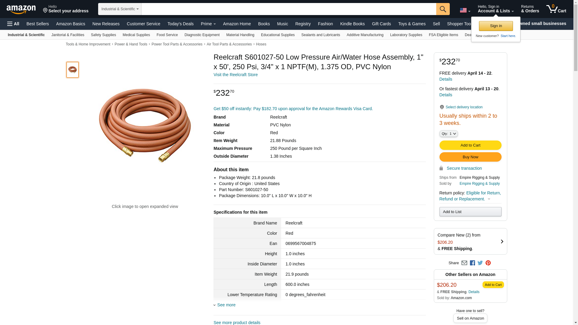 Reelcraft S601027-50 Low Pressure Air/Water Hose Assembly, 1" x 50', 250 Psi, 3/4" x 1 NPTF(M), 1.375 OD, PVC Nylon