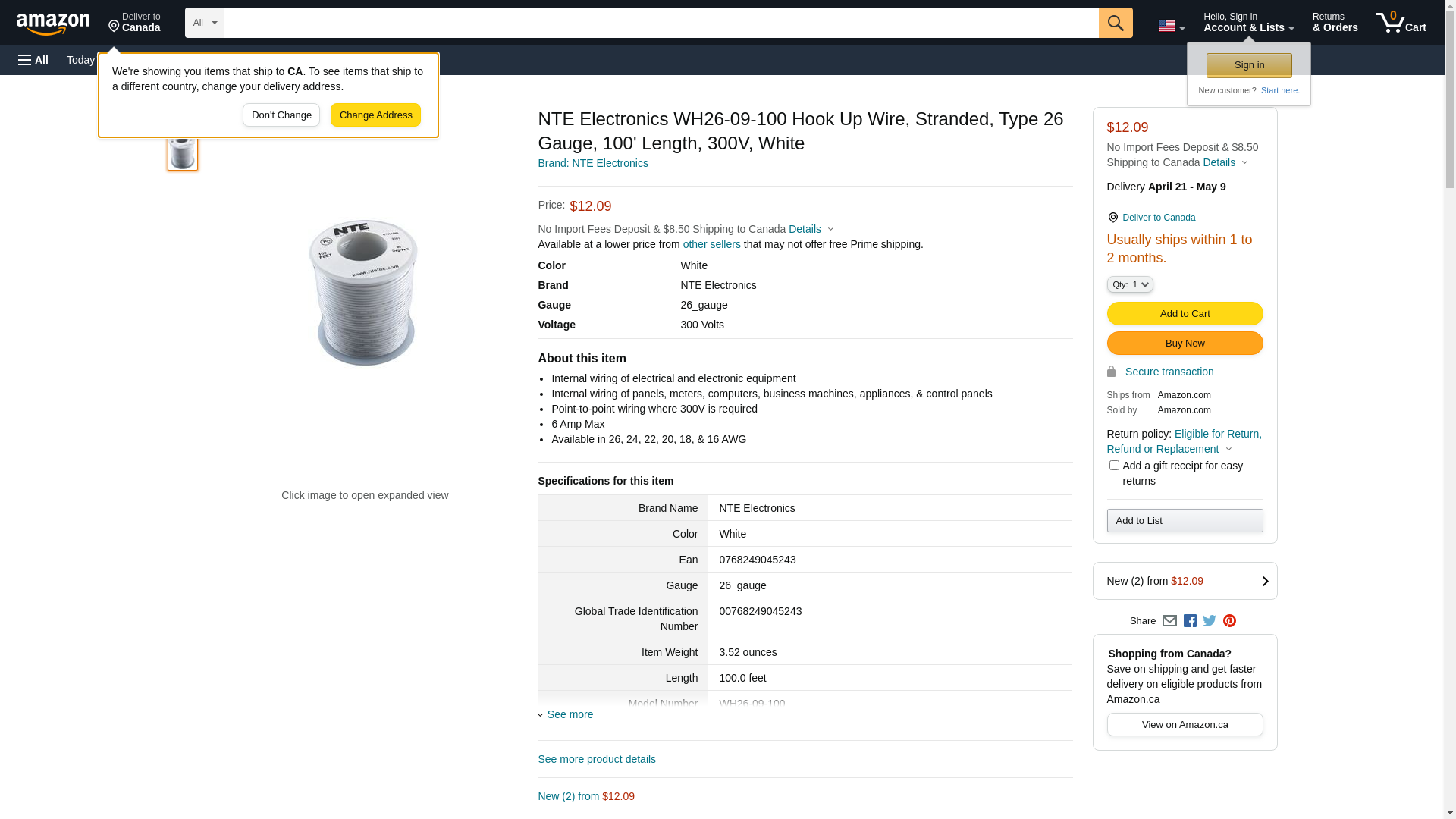 NTE Electronics WH26-09-100 Hook Up Wire, Stranded, Type 26 Gauge, 100' Length, 300V, White
