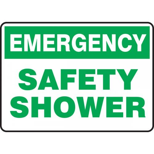 10" x 14" Plastic Sign: "Emergency Safety Shower" Help employees quickly locate emergency safety shower locations to reduce possible injury. Plastic (VP) Plastic combines standard, reliable performance with 92% recycled content to create a dependable, Earth-friendly material solution. Semi-flexible, impact-resistant plastic signs are ideal for standard-duty use for installation indoors and for protected, short-term outdoor applications. Get the look, feel and characteristics of non-recycled plastic signs in an environmentally friendly version.
