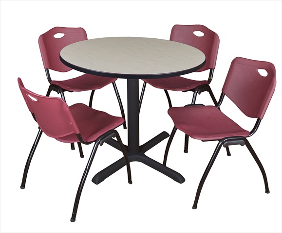 Cain 42" Round Breakroom Table- Maple & 4 'M' Stack Chairs- Burgundy