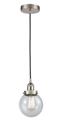 INNOVATIONS 616-1PH-SN-G204-6-LED 1-Light Mini Pendant Brushed Satin Nickel. Collection: Edison. Style: Industrial, Restoration-Vintage, Traditional. Metal Finish: Brushed Satin Nickel. Metal Finish (Canopy/Backplate): Brushed Satin Nickel. Material: Steel, Cast Brass, Glass. Dimension(in): 9.5(H) x 6(W) x 6(Dia). Min/Max Height (Fixture Height with Cord or Included Stems & Canopy)(in): 13/131. Wire/Cord: 10 Feet Of Black Fabric Cord. Bulb: (1)6W Medium Base,Dimmable(Not Included). Maximum Wattage Per Socket: 100. Voltage: 120. Color Temperature (Kelvin): 2700. CRI: 82. Lumens: 600. Glass Shade Description: Seedy Beacon. Glass or Metal Shade Color: Seedy. Shade Material: Glass. Glass Type: Seeded. Shade Shape: Sphere. Shade Dimension(in): 6(W) x 5.75(H). Fitter Measurement (Glass Or Metal Shade Fitter Size): 3.25 inch Fitter. Canopy Dimension(in): 4.75(Dia) x 1(H). Sloped Ceiling Compatible: Yes. California Proposition 65 Warning Required: Yes. UL & ETL Certification: Damp Location.