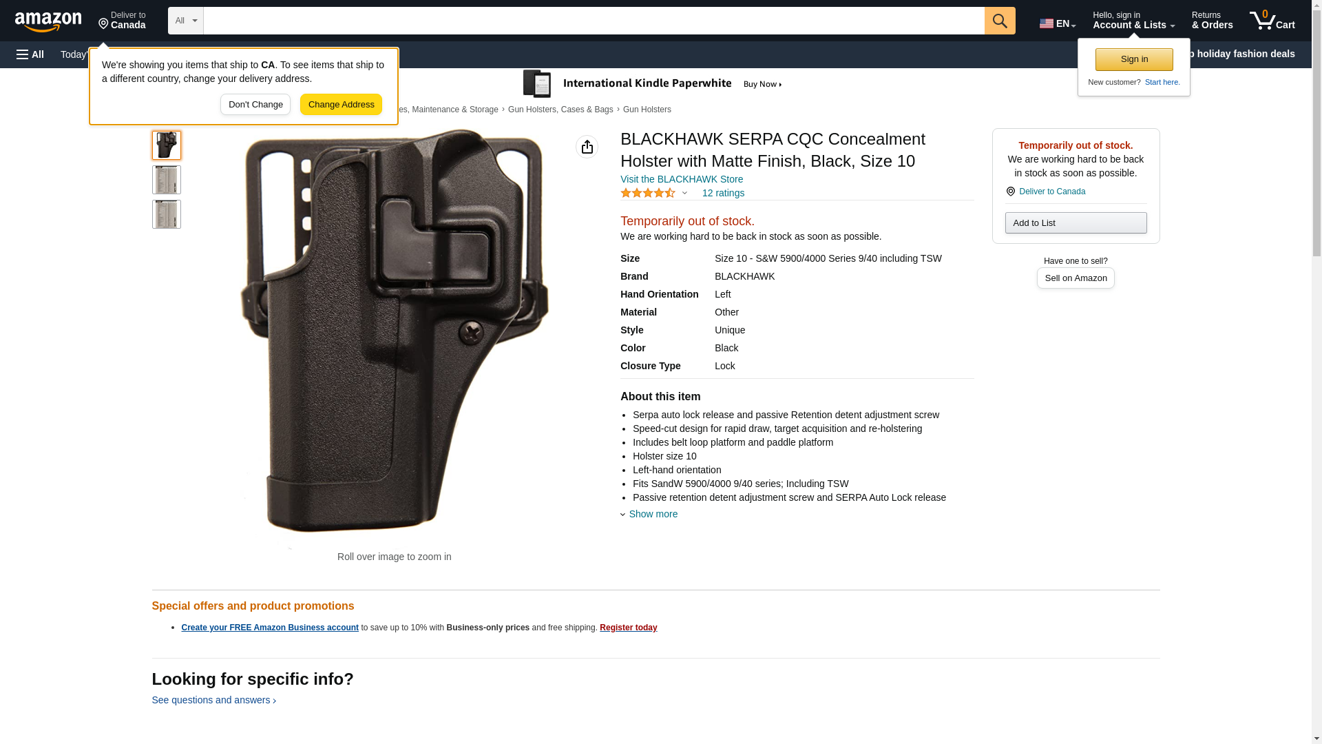 BLACKHAWK SERPA CQC Concealment Holster with Matte Finish, Black, Size 10