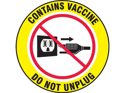 Accuform Contains Vaccine Do Not Unplug Adhesive Surface Safety Label, 4"Dia., Yellow/White/Black/Re | Quill.com