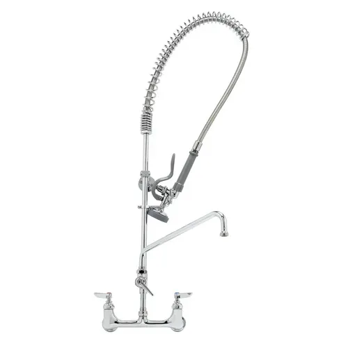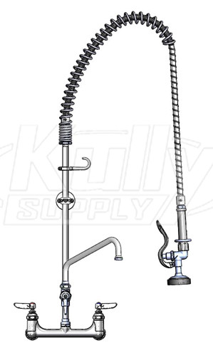 In a Hurry? Check out these key features: 44 in. Flexible Stainless Steel Hose Heat Resistant Gray Handle and Hold Down Ring Lever Handles with Color Coded Indexes Three Year Limited Warranty The B-0133-ADF12-B Pre-Rinse Unit features an 8 inch wall mount large flow mixing faucet, EasyInstall add-on faucet, 12 inch swing nozzle with stream regulator outlet, 18 inch rigid riser, 44 inch flexible stainless steel hose with heat resistant gray handle and hold down ring, Eterna compression cartridges with internal spring checks to prevent cross flow, adjustable centers (7 3/4 in. to 8 1/4 in.), and 6 inch adjustable wall bracket. This Pre-Rinse Unit meets NSF 61 - Section 9 and NSF 372 requirements for lead content. For more details and further clarification please see the specification sheet. What's in the Box? Pre-Rinse Unit