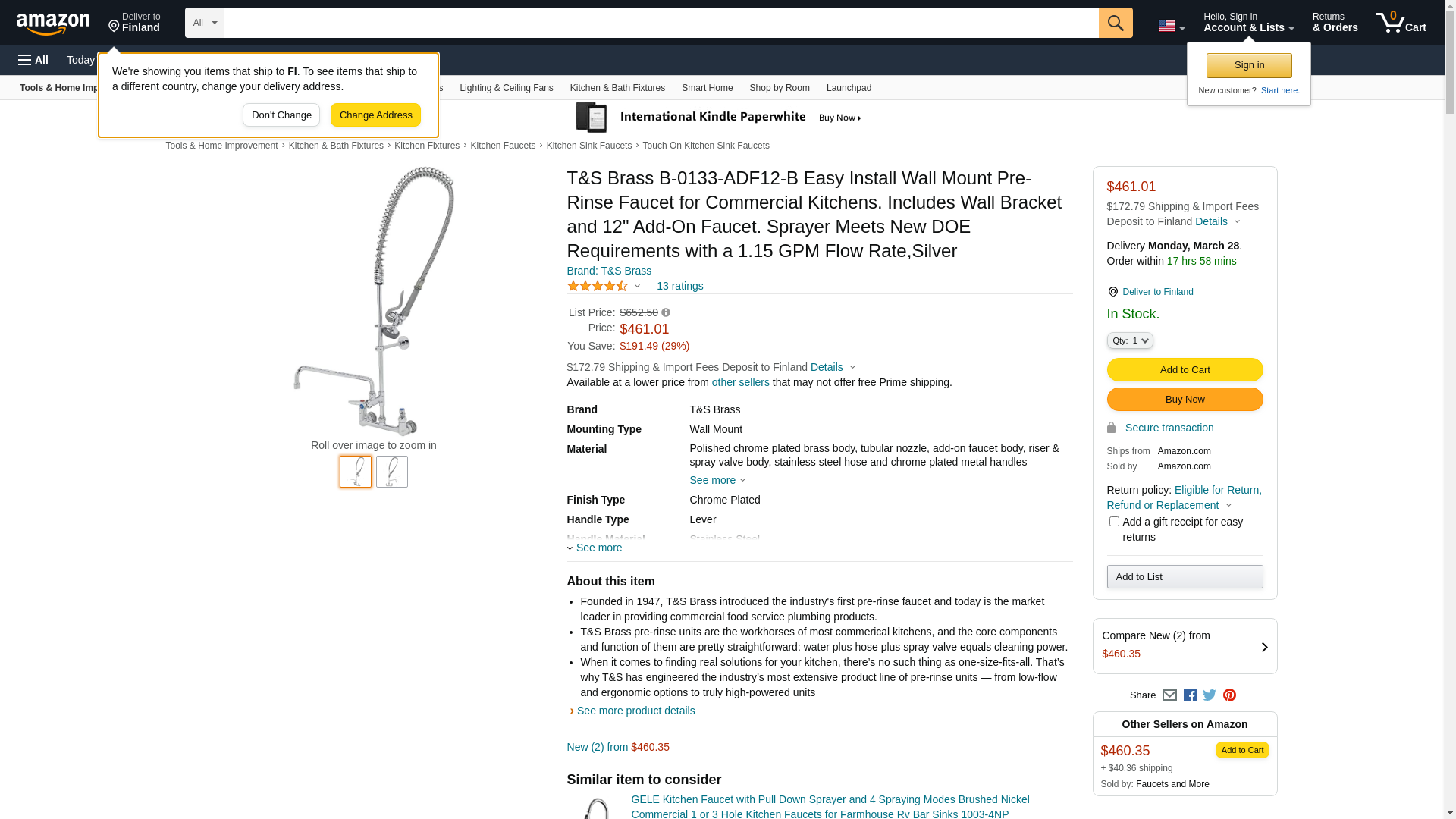 | Feature | Description: T&S Brass Easyinstall Pre-Rinse Unit With Wall Bracket &-Add On Faucet, B-0133-Adf12-B |