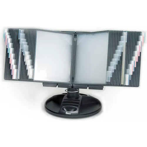 This rotating document stand has 40 pockets that swivel independently of the base to position pages where you want them. A chrome handle rotates the pages 360-degrees for optimum viewing. This high-volume document holder is built with a space-saving, 14" rotary supply base with molded compartments to organize business cards, notes, paper clips, pens, tape dispenser, stapler, and other accessories. The reference organizer includes 40 letter size pockets with 40 index tabs, displaying up to 80 pages of letter size reference sheets in transparent protective pockets. Great for displaying high-volume catalog pages and price lists. Assembly level/degree of difficulty: Easy.