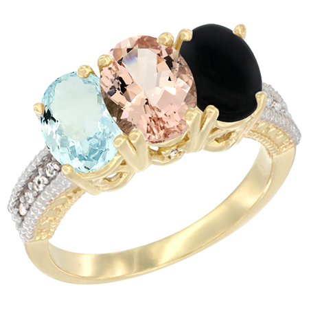 10K Yellow Gold Natural Aquamarine, Morganite & Black Onyx Ring 3-Stone Oval 7x5 mm, sizes 5 - 10