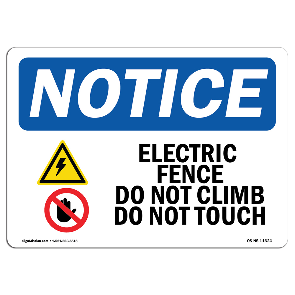 SignMission OS-NS-P-1014-L-11624 Notice Electric Fence Do Not Climb OSHA Plastic Sign