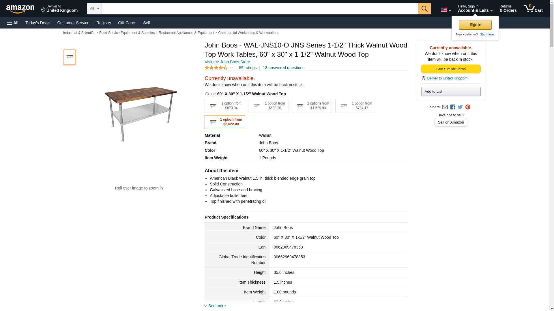 John Boos - WAL-JNS10-O JNS Series 1-1/2" Thick Walnut Wood Top Work Tables, 60" x 30" x 1-1/2" Walnut Wood Top