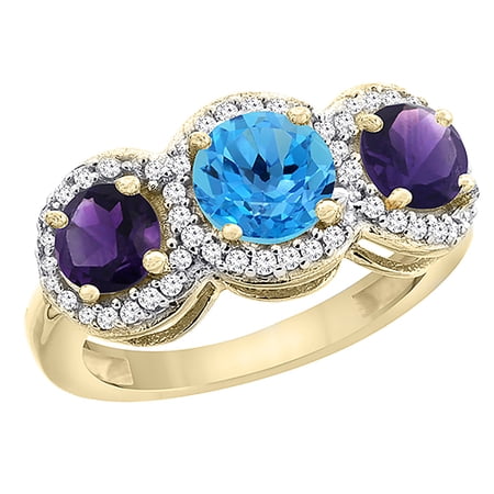 10K Yellow Gold Natural Swiss Blue Topaz & Amethyst Sides Round 3-stone Ring Diamond Accents, sizes 5 - 10