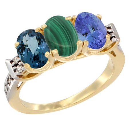 10K Yellow Gold Natural London Blue Topaz, Malachite & Tanzanite Ring 3-Stone Oval 7x5 mm Diamond Accent, sizes 5 - 10