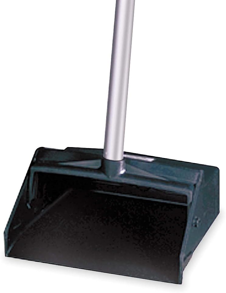 The dustpan is attached to a 32" aluminum handle and has a 12" x 11" plastic hopper that swings freely or locks upright. For use with lobby broom NSN 7920-01-572-7349.