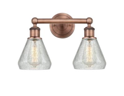 INNOVATIONS 616-2W-AC-G275 Conesus 2 15 inch Bath Vanity Light Antique Copper. Style: Industrial, Modern Contempo, Restoration-Vintage, Transitional . Collection Name: Edison. Metal Finish(Body): Antique Copper. Metal Finish(Canopy/Backplate): Antique Copper. Material: Steel, Cast Brass, Glass. Dimension(in): 12.5(H) x 15(W) x 7.5(Ext). Bulb: (2)60W Medium Base Incandescent(Not Included). Voltage: 120. Dimmable: Yes. Color Temperature (Kelvin): 2200. Color Rendering Index (CRI): 99.9. Lumens: 220. Life Expectancy (Hours): 2000. Glass Shade Description: Clear Crackle Conesus. Glass Type: Crackled. Shade Shape: Cone. Glass or Metal Shade Color: Clear Crackle. Shade Material: Glass. Shade Dimension(in): 6(W) x 5.75(H). Fitter Measurement (Glass Or Metal Shade Fitter Size): Neckless with a 2 inch opening. Backplate Dimension(in): 4.5(W) x 0.75(Depth). ADA Compliant: No. California Proposition 65 Warning Required: Yes. UL/ETL Certification Type: Damp Location.