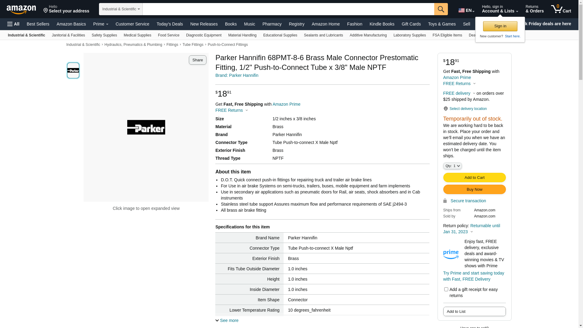 - Item|Push-to-Connect Male Straight Connector#Brand|Parker#Model|68PMT-8-6#Size|1/2 Tube X 3/8 NPTF Male#Type|Prestomatic#Material|Brass/Buna N O-Ring/SS Tube Support#Max Pressure|250 PSI