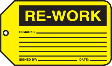Accuform MMT306PTP Safety Tag, Legend "RE-Work", 0.015" Thickness, RP-Plastic, 5.75" x 3.25", Black on Yellow (Pack of 25)