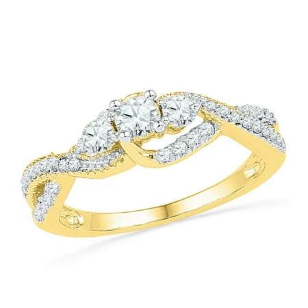 <p><span style="font-size:16px;"><b><u>Description</u></b><br /></span></p> <p><span style="font-size: 14px;">10k Yellow Gold Womens Round Diamond 3-stone Bridal Wedding Engagement Ring 5/8 Cttw</span></p> <br /> <p><span style="font-size:16px"><u><b>Gemstone Details</b></u></span></p> <p><span style="font-size:14px">5/8 Carats total weight --- 1/5 carat center solitaire<br /><br />All diamonds are natural and conflict-free in origin<br /><br /></span></p> <ul type="square"> <b>Round Center Diamond</b> <br /> <li>1/5 ct.t.w.</li> <li>SI3 clarity</li> <li>G-H color</li> <li>Prong setting</li> </ul> <br /> <ul> <b>Round Diamond</b> <br /> <li>3/8 ct.t.w.</li> <li>I1 clarity</li> <li>H-I color</li> <li>Pave setting</li> </ul> <br /> <p><span style="font-size:16px"><u><b>Specifications</b></u><br /></span></p> <p><span style="font-size:14px">10kt Yellow Gold<br />Widest point width: 6 mm (.24 inches )<br />Width of shank: 2 mm<br />3.17 grams (approximately)<br />Ring size selectable</span></p> <p><span style="font-size:11px">Combined diamond weight of 5/8 carats total weight represents a range of 0.59 - 0.70 cts. t.w.</span></p>