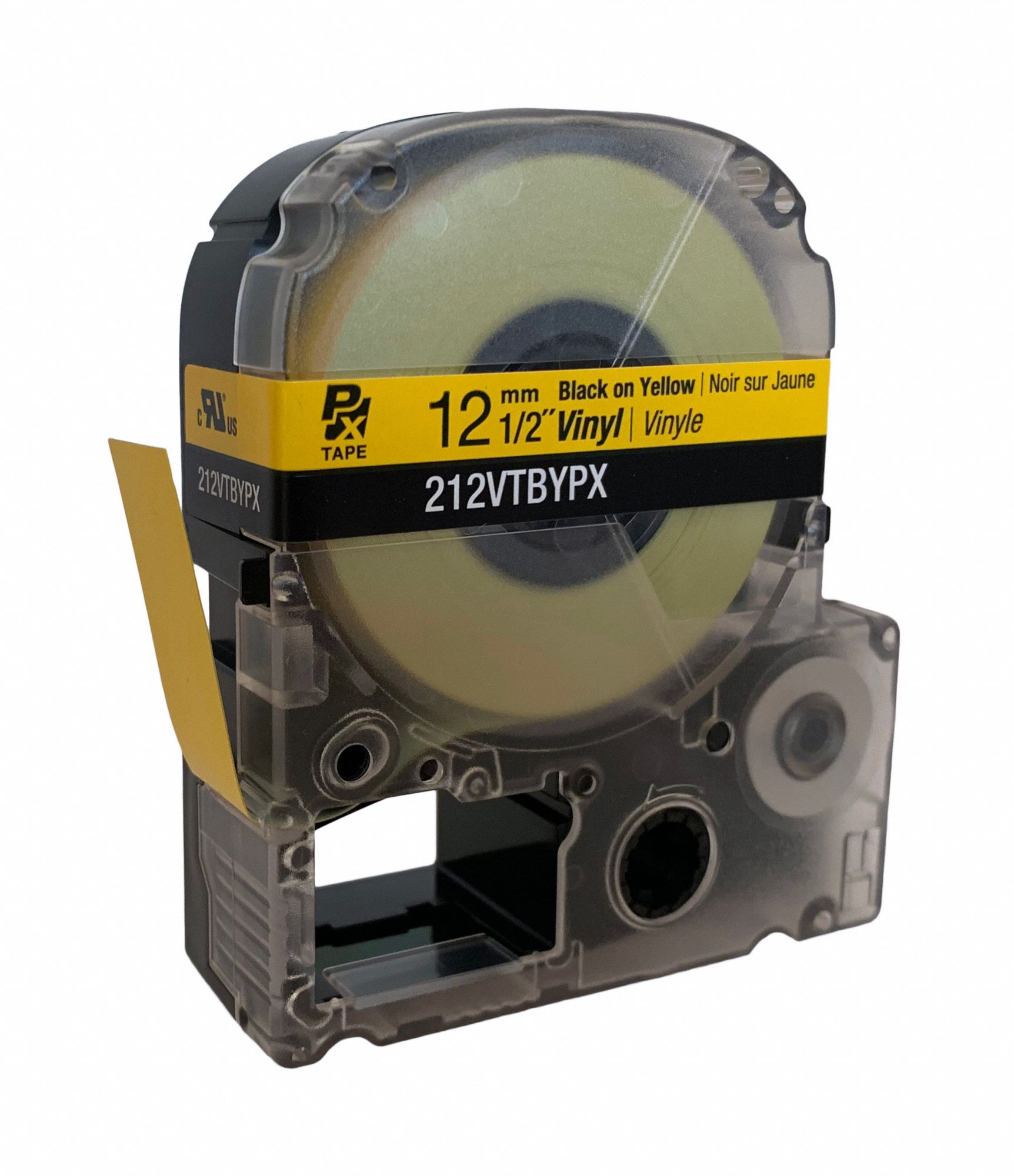212VTBYPX - Epson LabelWorks PX series standard label cartridge, 12mm (1/2in) wide, 22.9ft roll, black text, yellow background, vinyl. For use with Epson...
