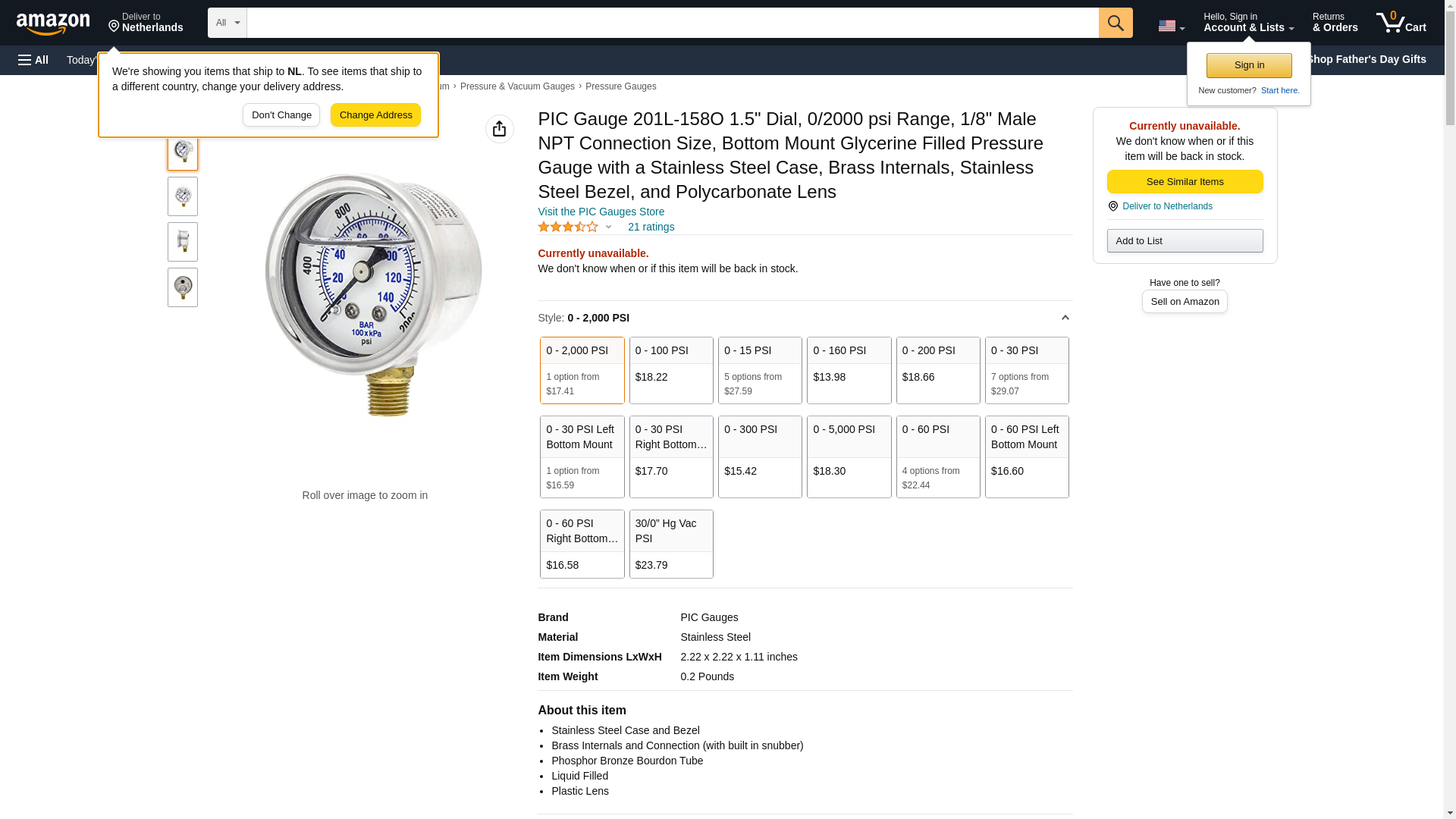PIC Gauges 201L-158O Bottom Mount Glycerine Filled Pressure Gauge w/ SS Case, Brass Internals, SS Bezel, PC Lens, 1.5" Dial, 0/2000 psi Range, 1/8" Male NPT