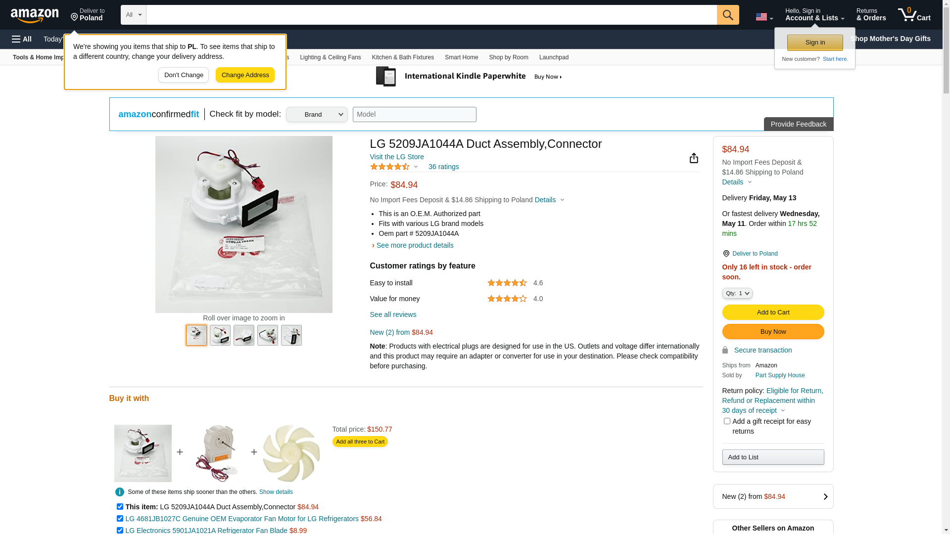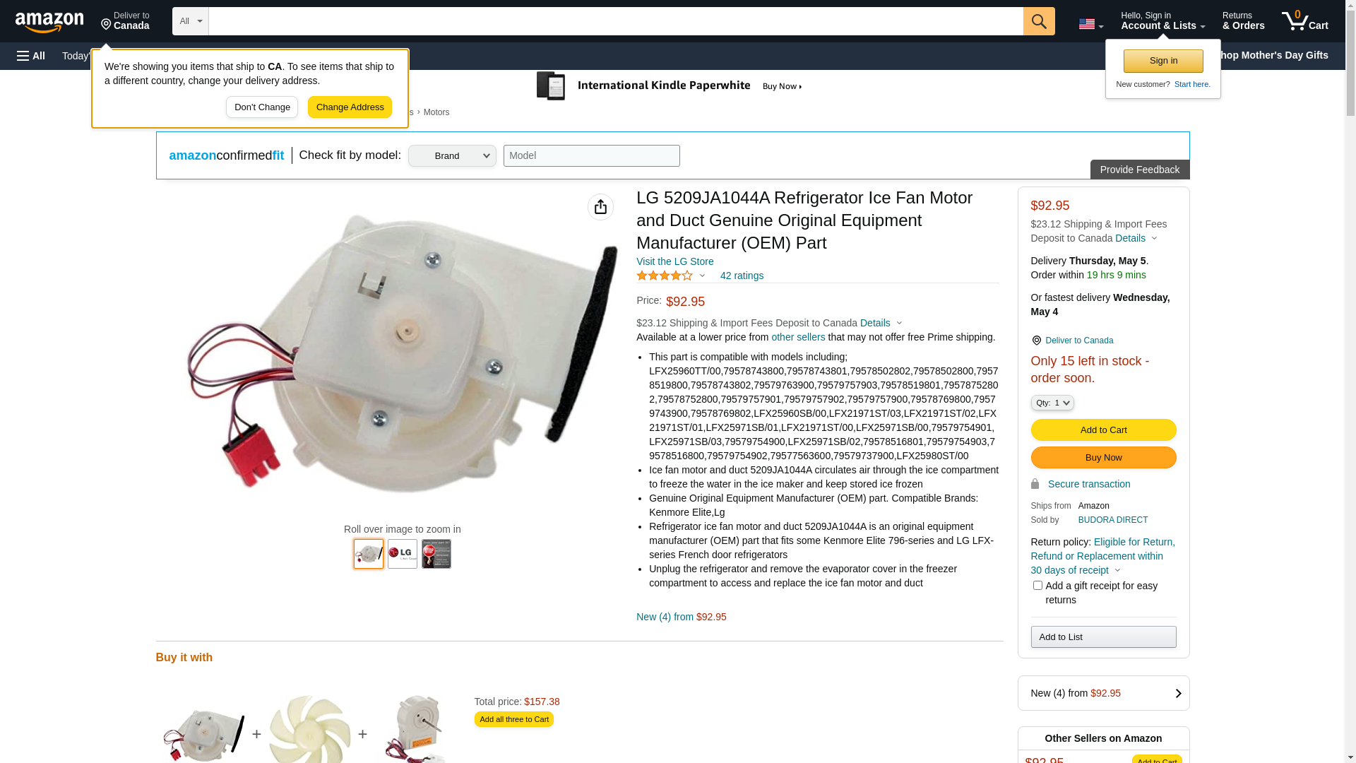 Genuine Original Equipment Manufacturer (OEM) parts! Refrigerator ice fan motor and duct 5209JA1044A is an original equipment manufacturer (OEM) part that fits some Kenmore Elite 796-series and LG LFX-series French door refrigerators. Ice fan motor and duct 5209JA1044A circulates air through the ice compartment to freeze the water in the ice maker and keep stored ice frozen. Unplug the refrigerator and remove the evaporator cover in the freezer compartment to access and replace the ice fan motor and duct. Model numbers this part fits: 79577562600, 79577563600, 79577564600, 79577569600, 79577572600, 79577573600, 79577579600, 79578502800, 79578503800, 79578503801, 79578503802, 79578506800, 79578509800, 79578512800, 79578512801, 79578513800, 79578516800, 79578516801, 79578519800, 79578519801, 79578733800, 79578733801, 79578733802, 79578739800, 79578739802, 79578743800, 79578743801, 79578743802, 79578749800, 79578749802, 79578752800, 79578752802, 79578753800, 79578753801, 79578753802, 79578754800, 79578759800, 79578762800, 79578762802, 79578763800, 79578763802, 79578764800, 79578764802, 79578769800, 79578769802, 79579732900, 79579733900, 79579737900, 79579742900, 79579743900, 79579747900, 79579752900, 79579753900, 79579753903, 79579754900, 79579757900, 79579759900, 79579762900, 79579763900, 79579764900, 79579769900, LFX21960ST/00, LFX21971ST/00, LFX21971ST/01, LFX21971ST/02, LFX21971ST/03, LFX21975ST/00, LFX21975ST/01, LFX21980ST/00, LFX21980ST/01, LFX25950SB/00, LFX25950SW/00, LFX25950TT/00, LFX25960SB/00, LFX25960ST/00, LFX25960SW/00, LFX25960TT/00, LFX25961SB/00, LFX25961ST, LFX25961SW/00, LFX25961SW/01, LFX25971SB/00, LFX25971SB/01, LFX25971SB/02, LFX25971SB/03, LFX25971ST/00, LFX25971ST/01, LFX25971ST/02, LFX25971ST/03, LFX25971SW/00, LFX25971SW/01, LFX25971SW/02, LFX25971SW/03, LFX25975SB/00, LFX25975SB/01, LFX25975ST/00, LFX25975ST/01, LFX25975SW/00, LFX25975SW/01, LFX25980ST/00, LFX25980ST/01 For Kenmore Elite & Lg.
