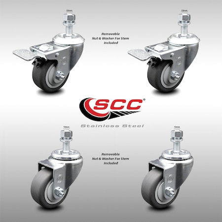 Stainless Steel Thermoplastic Rubber Swivel Threaded Stem Caster Set of 4-3.5" x 1.25" Gray Wheels & 12MM Metric Stems-Includes 2 with Total Locking Brake-920 lbs Total Capacity-Service Caster Brand