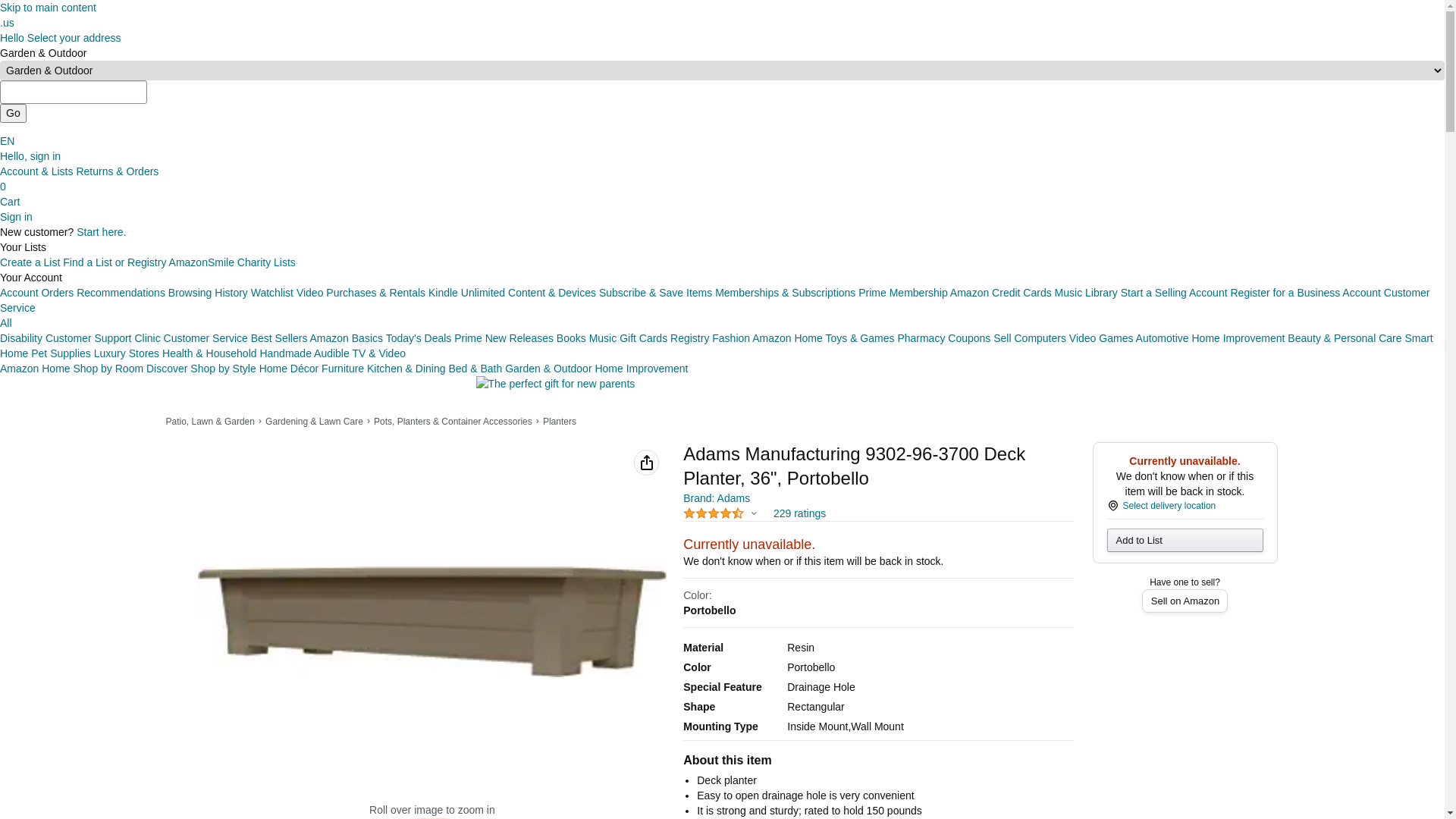 The Deck Planter provides an extra-large, sturdy deck box - perfect to add color to the deck or patio. Stronger than typical planters, the thick walls will not bend when planted. The planter includes a plug for easy drainage. Constructed of durable resin, the Deck Planter will not rust, peel or rot and is UV protected to maintain its color. Proudly made in the USA.