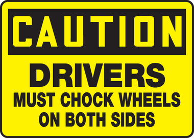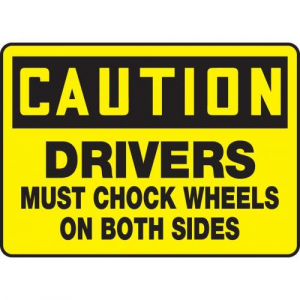 Accuform, MTKC608XT, 10" x 14" OSHA Caution Safety Sign "Driver Must Chock Wheels on Both Sides" Dura-Plastic Features: Semi-rigid .060" thick polycarbonate with a protective coating Protected by UV protective coating Resists abrasion, humidity, and chemicals Service temperature range: -40 to 251 F Rounded corners and 3/16" mounting holes on most sizes, will be adjusted for larger sizes