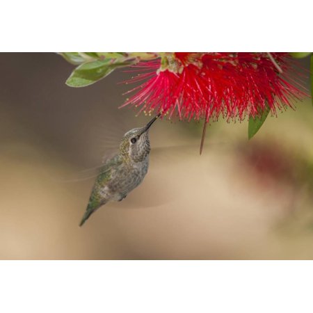 <ul> <li>Title: Annas Hummingbird in Flight. Sipping Nectar from a Bottle Brush</li> <li>Artist: Michael Qualls</li> <li>Product Type: Photographic Print</li> </ul>