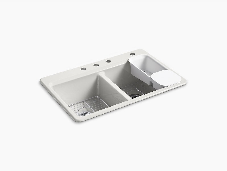 KOHLER K-8679-4A2-FF RIVERBY 33 INCH DROP IN DOUBLE BASIN CAST IRON KITCHEN SINK, SEA SALT