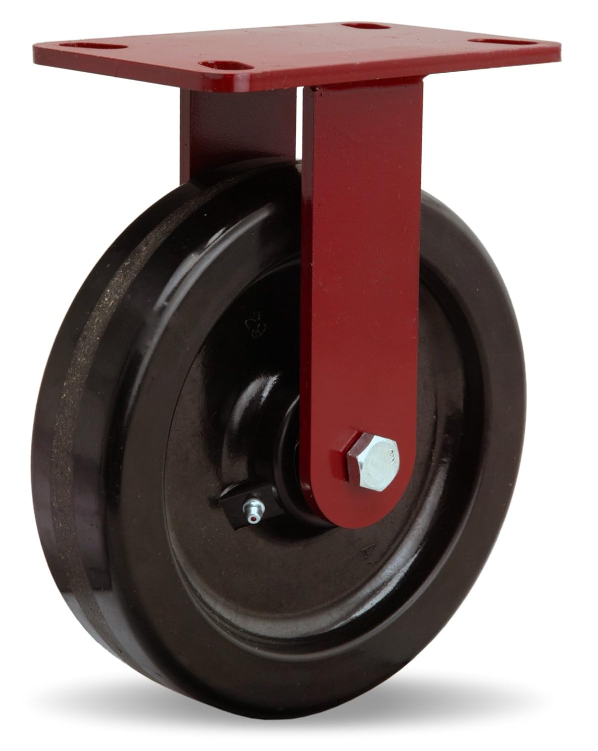 The heavy service casters are the toughest casters you can buy in the 2" wide wheel class because of their premium drop forged steel construction. Hamilton heavy service rigid caster with 8" x 2" plastex phenolic wheel with 3/4" straight roller bearing. Bolt hole 1: 3-3/8" x 5-1/4". Bolt hole 2: 2-3/8" x 4-15/16. Bolt size: 0.5". Caster rig type: forged steel. Swivel or rigid caster: rigid. Caster color/finish: crimson red. Wheel color/finish: black. Wheel diameter: 8". Load capacity (lbs.): 1400. Overall height: 9-3/4". Top plate measures: 6-1/2" length by 4-1/2" width. Wheel face: 2". Wheel type: plastex. Plastic material. High rolling ease, high relative capacity. No quiet operations, poor floor protection. Low cushioning (resilience), medium impact resistance. Low moisture resistance, medium abrasion resistance. Low relative cost. -50 Degrees F low temperature range. 300 Degrees F high temperature range. Poor chemical resistant.