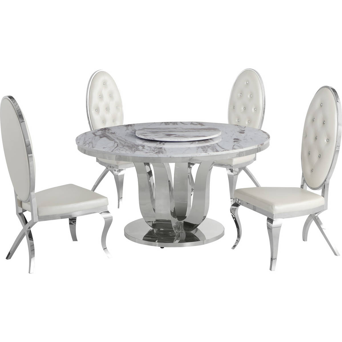 Best Quality D16L-4SC60 D16 6 Piece Dining Set w/ Lazy Susan in White Marble, Stainless & White Leatherette