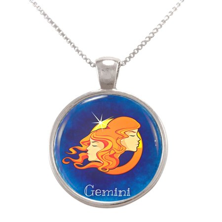 Gemini Illustration Zodiac Image Pendant Necklace. The image is displayed under photo-optic quality acrylic for a perfectly clear glossy image that is also protected from wear and tear. This listing is for 1 pendant and necklace as pictured. It includes the pendant as shown and a Sterling Silver Plate snake chain necklace. The pendant is made of nickel coated brass and is approximately 1 inch (27mm) in diameter and weighs approximately 0.14 ounces (4 grams). This pendant includes an 18 Sterling Silver Plated Snake Chain necklace with a C style spring clasp. 100% hand crafted in the USA. SKU #34776