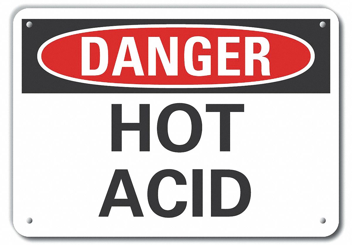 Plastic Hot Acid Danger Sign, Horizontal Rectangle, Number of Printed Sides 1, English, Sign Format Traditional OSHA, Sign Legend Hot Acid, Sign Legend Background Color White, Sign Legend Style Text