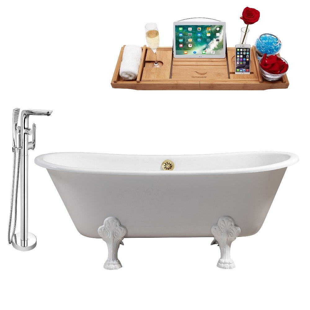 Streamline RH5061WH-GLD-120 67 Inch Cast Iron Tub in White with Tray and Faucet Set in Polished Chrome
