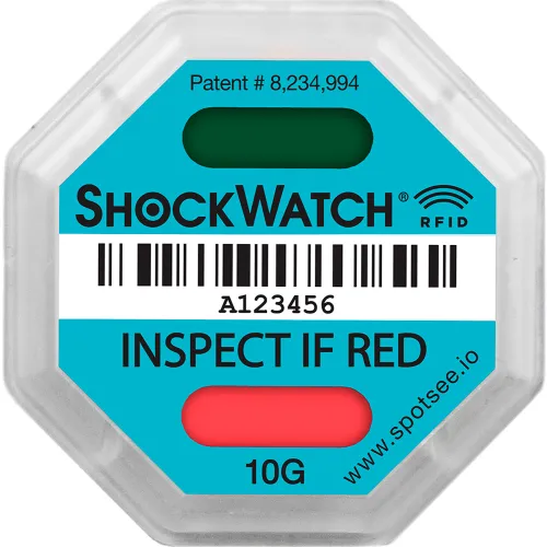 The 10G SpotSee ShockWatch RFID impact indicator is a tamperproof device that determines if products have been dropped during transit or while in storage. Incorporating both visual and RFID (radio-frequency identification) alerts, these indicator tags can be scanned with a standard UHF reader and allow companies to leverage the inventory tracking benefits of RFID and the benefits of an impact monitoring program. Affix the ShockWatch RFID tag and each time a package is moved among carriers, distribution centers, and final destinations and scanned by an RFID reader, its condition is entered automatically into the enterprise resource planning (ERP) software or warehouse management system. Each tamperproof indicator can be correlated to specific package and ensures that the device has not been switched during transport. These shipping labels are a proactive tool to help your business spend less time remediating negative events, and provide indisputable evidence of mishandling or packaging issues. ShockWatch RFID tags are easy to add to existing RFID inventory systems or enterprise resource planning systems because they can be read by any UHF RFID reader. ShockWatch RFID applications include automotive parts, medical devices, healthcare and hospital equipment, electronics, packaging, logistics and supply chain, musical instruments, furniture, medical instruments, appliances, pallets, aerospace components, defense components, glass, building materials, warehousing, and more. Available sensitivities include: 75G, 50G, 37G, 25G, 15G, 10G, and 5G. (When sensor is subjected to a shock acceleration that exceeds the G value number, the indicator will turn red and the RFID circuit will be switched. The larger the number is, the greater impact required to trigger the device; i.e. more fragile products require a lower G indicator, more durable products may need a higher G indicator.