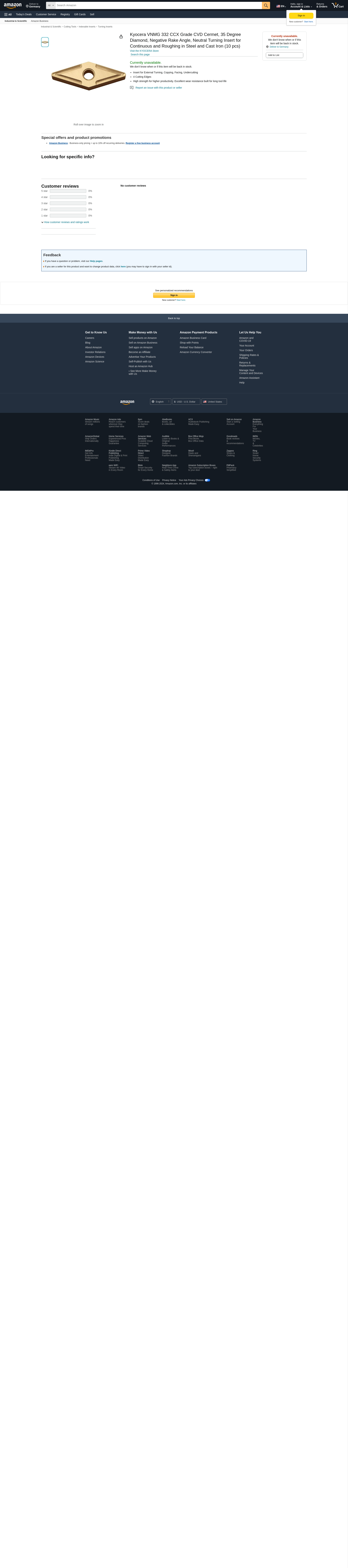 Kyocera VNMG 332 CCX Grade CVD Cermet, 35 Degree Diamond, Negative Rake Angle, Neutral Turning Insert for Continuous and Roughing in Steel and Cast Iron (10 pcs)