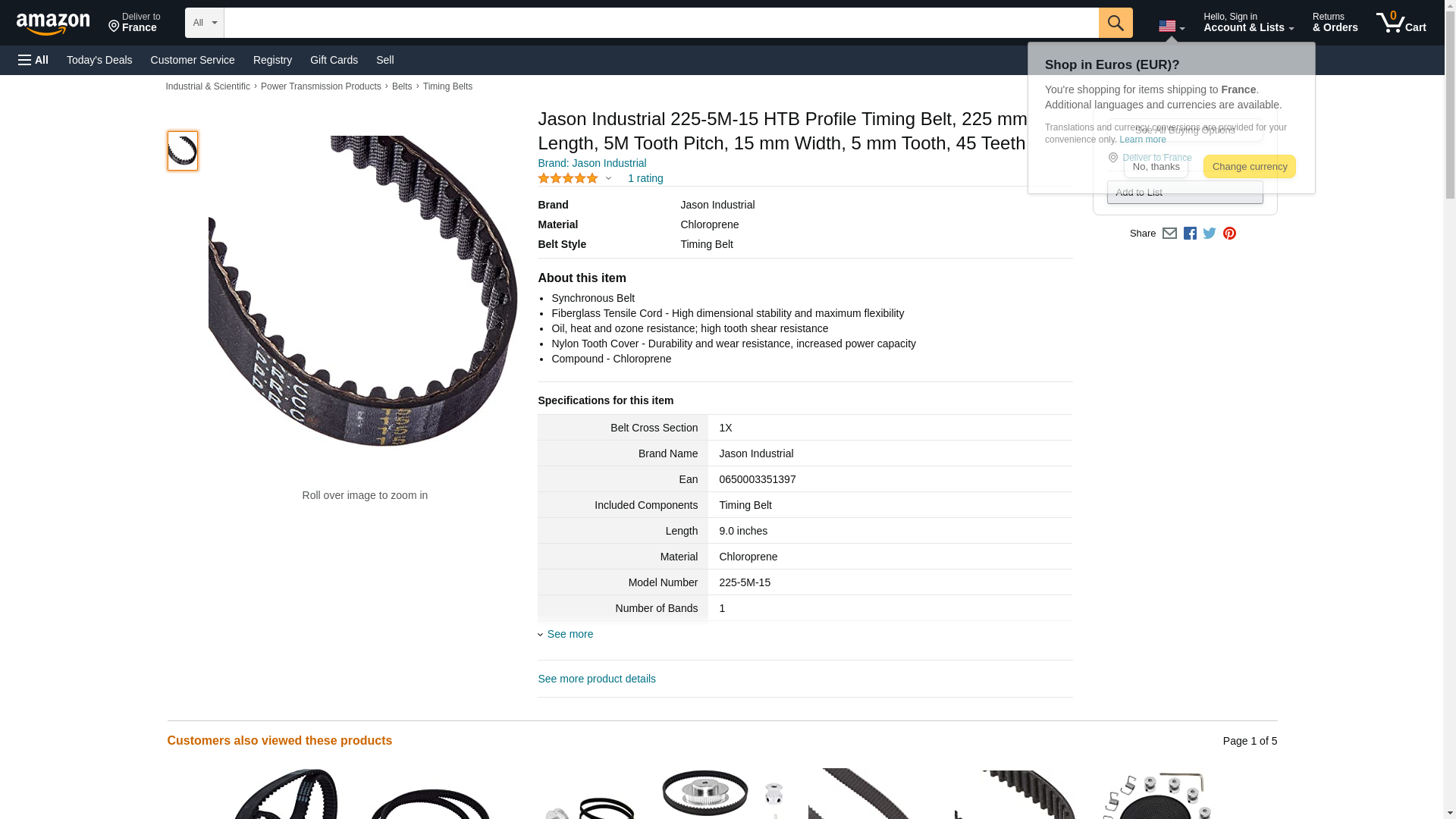 Jason Industrial 225-5M-15 5mm tooth profile HTB timing beltPackage of 10 pieces $5.89694 per piece