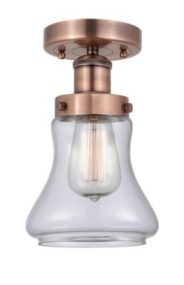 INNOVATIONS 616-1F-AC-G192 Bellmont 1 6.5 inch Semi-Flush Mount Antique Copper. Style: Art Nouveau, Industrial, Restoration-Vintage, Transitional . Collection Name: Edison. Metal Finish(Body): Antique Copper. Metal Finish(Canopy/Backplate): Antique Copper. Material: Steel, Cast Brass, Glass. Dimension(in): 8.25(H) x 6.5(W) x 6.5(Dia). Bulb: (1)60W Medium Base Incandescent(Not Included). Voltage: 120. Dimmable: Yes. Color Temperature (Kelvin): 2200. Color Rendering Index (CRI): 99.9. Lumens: 220. Life Expectancy (Hours): 2000. Glass Shade Description: Clear Bellmont. Glass Type: Transparent; Ribbed. Shade Shape: Bowl. Glass or Metal Shade Color: Clear. Shade Material: Glass. Shade Dimension(in): 6.125(W) x 6.25(H). Fitter Measurement (Glass Or Metal Shade Fitter Size): 3.25 inch Fitter. Canopy Dimension(in): 0.75(H) x 4.5(Dia). Sloped Ceiling Compatible: No. California Proposition 65 Warning Required: Yes. UL/ETL Certification Type: Damp Location.