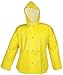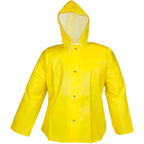 Yellow, 26 mil PVC on 12 oz./yd² stitched non-woven lining for added comfort; snap closures on front; stitch-bonded; Therm-O-Rad heat sealed seams; attached hood with adjustable cord around face.