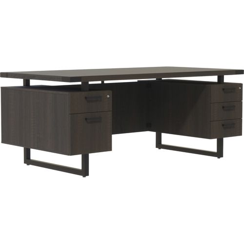 - Complete with double pedestals featuring one with three storage-sized drawers and one with a storage drawer and a file drawer accentuated with discrete brackets giving the appearance of a floating workstation
