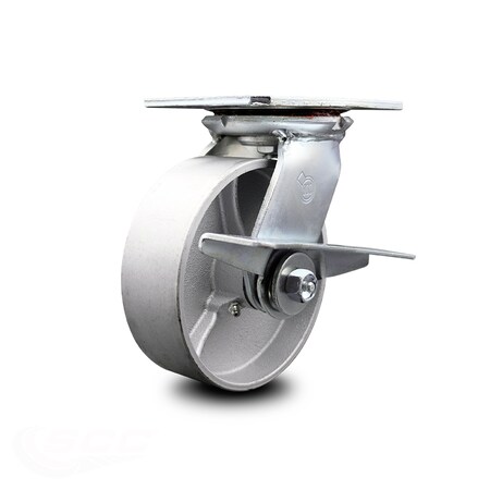 Heavy Duty Large Top Plate Semi Steel Cast Iron Swivel Caster w/6" x 2" Silver Wheel & Side Lck Brake - 1200 lbs Capacity/Caster - Service Caster Brand